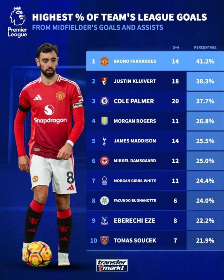 直播吧3月10日讯《转会市集》统计了本赛季英超中场球员参与全队联赛总进球的比率,B费独占榜首。