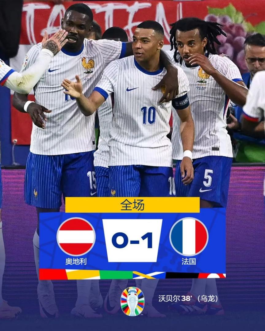 最终法国队一球小胜。自2000年6月21日以来,法国队在先进球的欧洲杯比赛中从未输球。