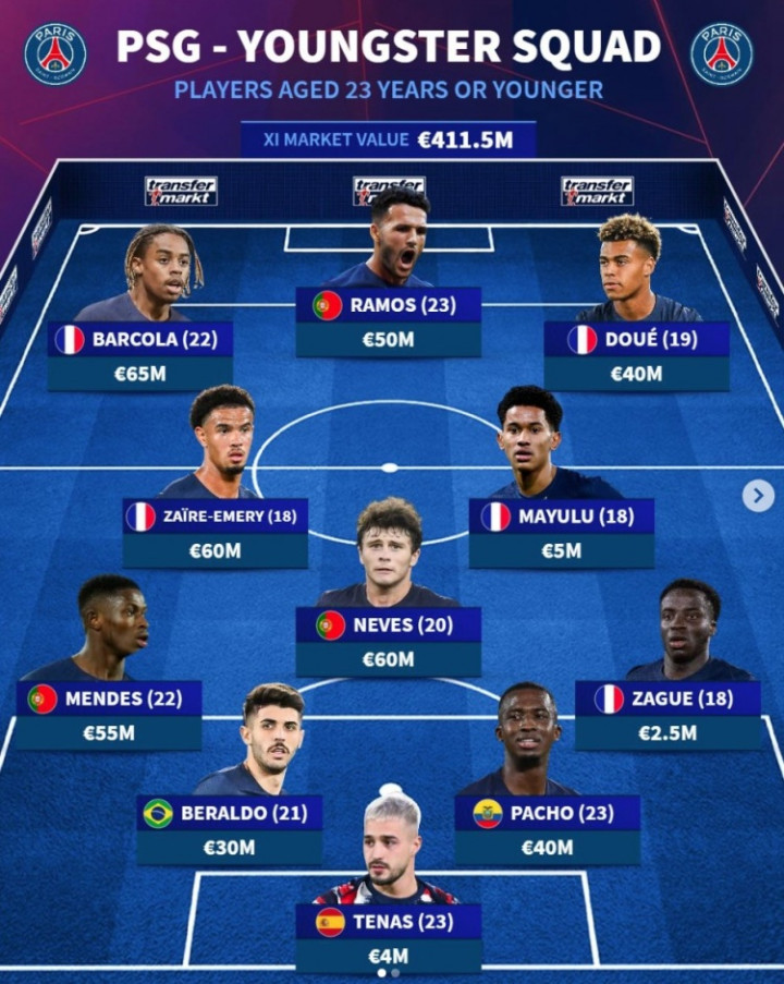 直播吧3月2日讯巴黎在本赛季恩里克携带下各条阵线王人呐喊大进,更是刮起了芳华风暴,《转会市集》便列出了巴黎现时的U23首发阵。