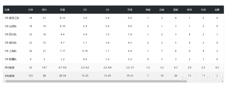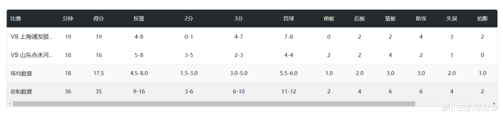 罗欣棫这两场比赛齐莫得登场达到20分钟,首秀对阵上海队的比赛19分钟,8中4+三分7中4拿到19分4助攻2篮板2抢断,三分射中率57.1%。