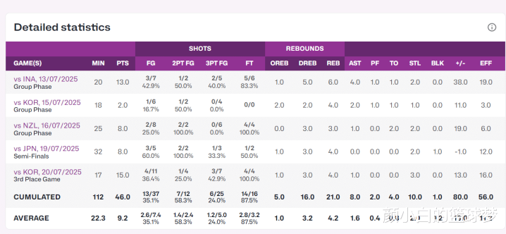 今夏的亚洲杯中国女篮只是是季军,罗欣棫等于是顶替了李梦的三号位轮流席位,场均22.3分钟,拿到9.2分1.6助攻4.2篮板2抢断0.2盖帽,射中率35.1%,三分射中率24%,她终于扫去了亚洲杯三分失准的昏昧。