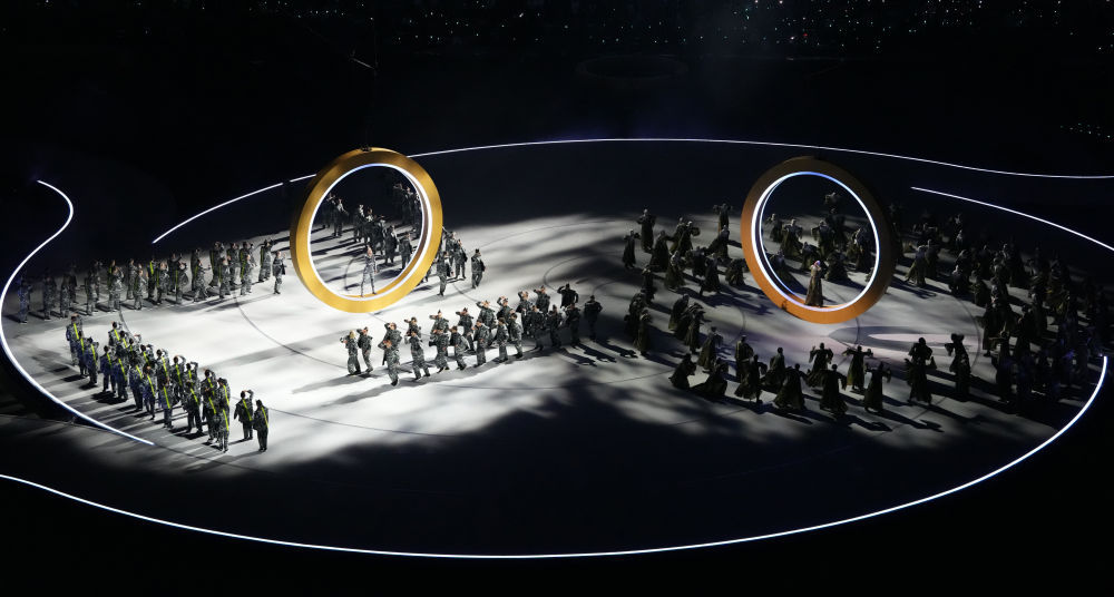 两名舞者,衣饰不同,舞姿差异,区分代表着“城市”与“山脉”。在这场城与山的对话中,两名舞者各自站在一个圆环中间。圆环慢慢起飞,两东谈主从各自的圆环跃出,象征着走出我方的宇宙,寻找交织点,完毕东谈主类共通。随后,更多圆环慢慢飞腾、互相交织,在舞台上空酿成奥运五环标志。