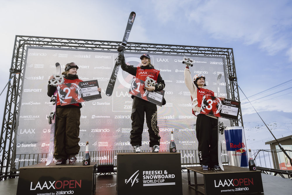 2026年1月17日,在瑞士莱克斯举行的海外雪联寰宇杯系列赛中得回女子解放式滑雪坡面辞谢技术冠军的谷爱凌(中)在领奖台上。新华社发(马塞尔·莱默希特 摄)